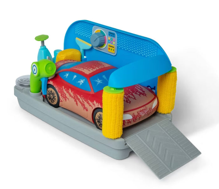 Wash, rinse, and roll with the Melissa & Doug Spray & Shine Car Wash Play Set, featuring a color-changing jumbo sports car and 14 play pieces for cool, water-activated fun!