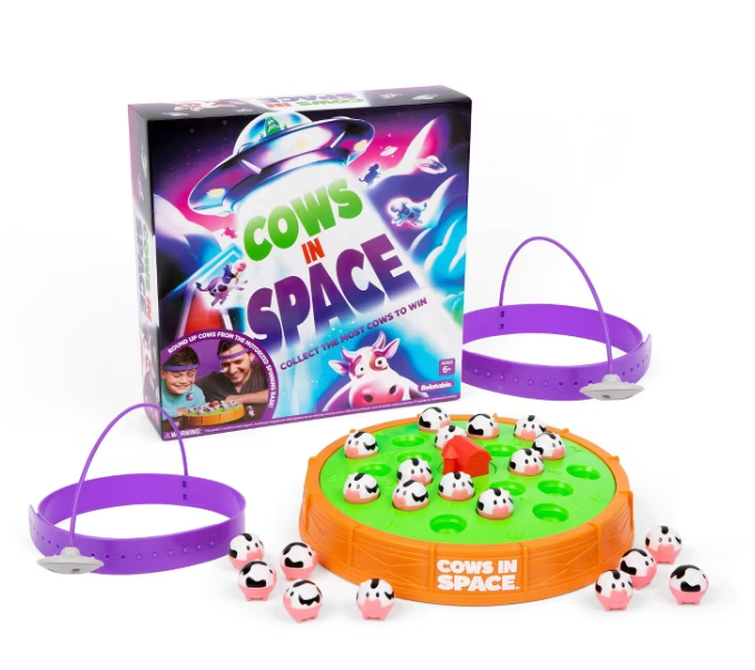 Blast off into hilarious fun with Cows in Space! This fast-paced reflex game challenges two players to wear magnetic UFO headbands and catch flying cows from a spinning base. Perfect for kids ages 6+, it builds coordination, focus, and quick thinking while keeping everyone laughing. The set includes 21 magnetic cows, 2 headbands, and a spinning launcher—everything needed for instant game night excitement. A 2026 Toy of The Year Finalist, it's the silly, active gift that families and space enthusiasts will love.