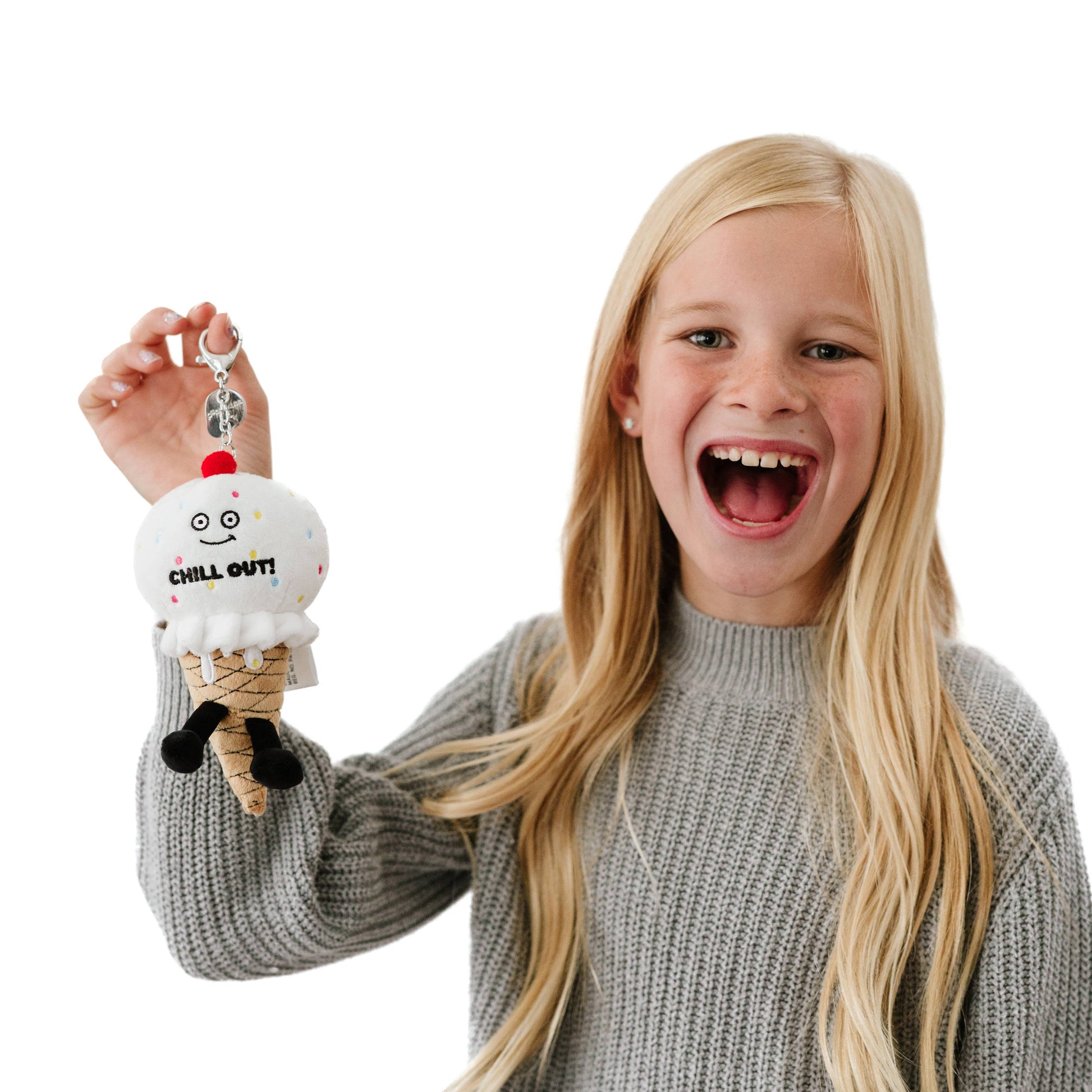 Here's the scoop: This bag charm is too cute to ignore. Don't get it twisted, though. He's a cool dude who needs everyone to just chill out. With this bite-sized plush, it's all about the toppings. His 3D cherry, colorful sprinkles, and cone body make him extra sweet. He'd make the perfect accessory for any bag, backpack, or purse. This plush is ideal for children, collectors, or anyone who loves cozy and fun decor.